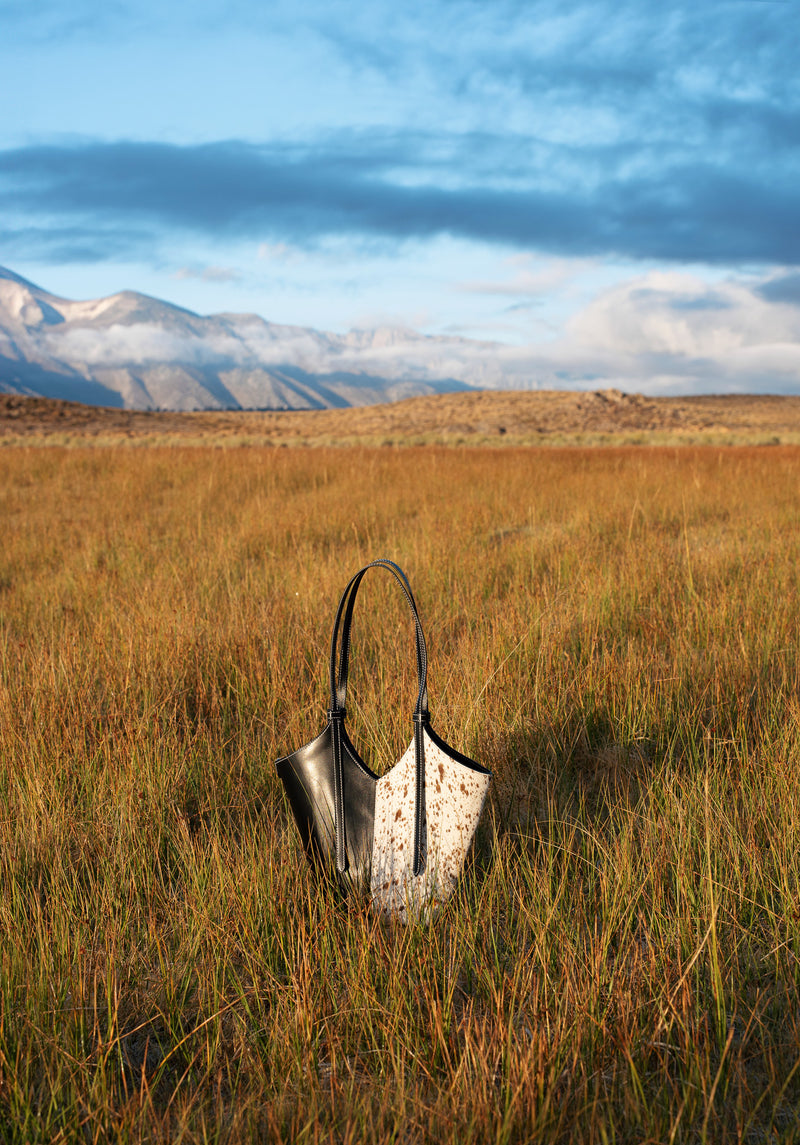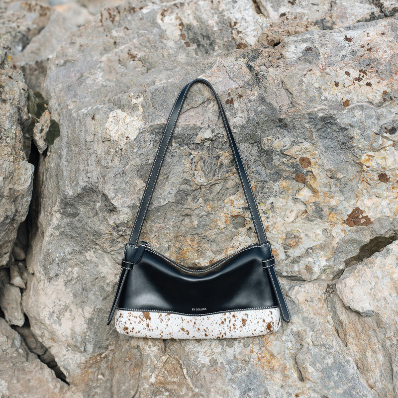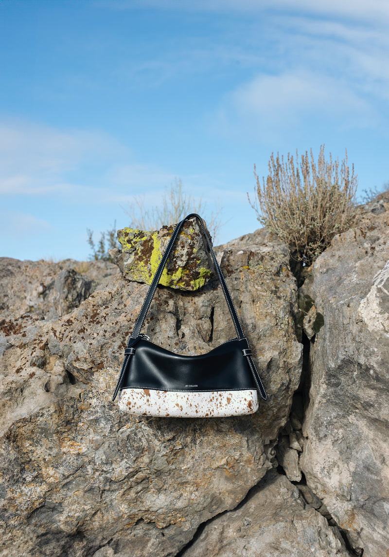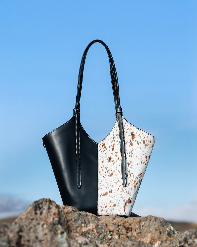 Smooth black Italian leather meets spotted calf hair and cream contrast stitching. Effortless statement pieces designed to turn heads.