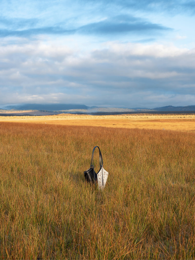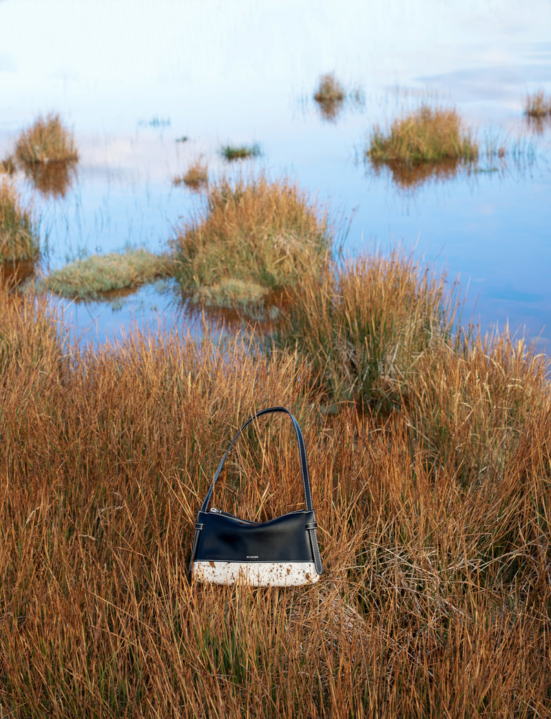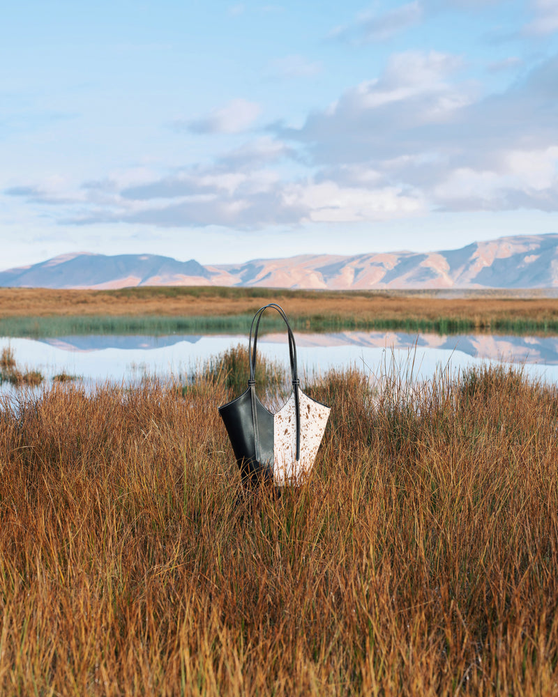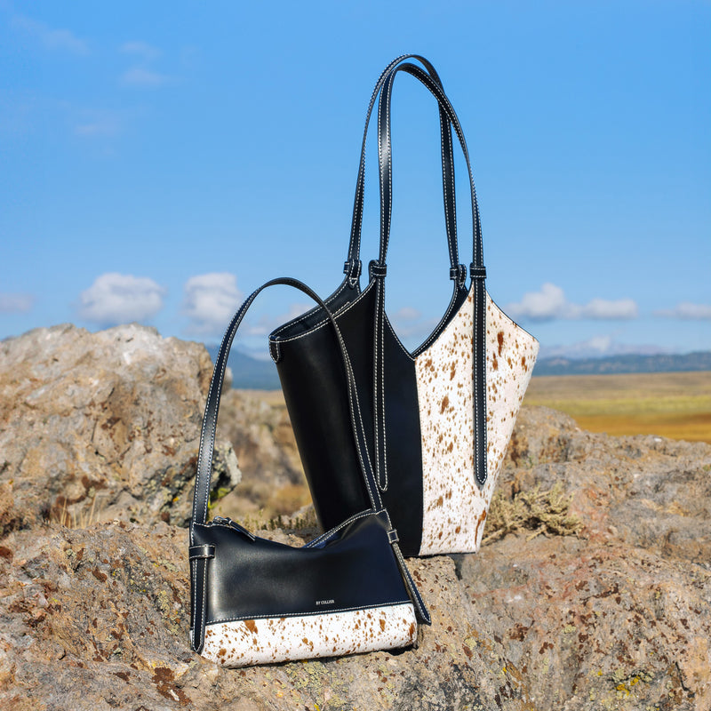 Smooth black Italian leather meets spotted calf hair and cream contrast stitching. Effortless statement pieces designed to turn heads.