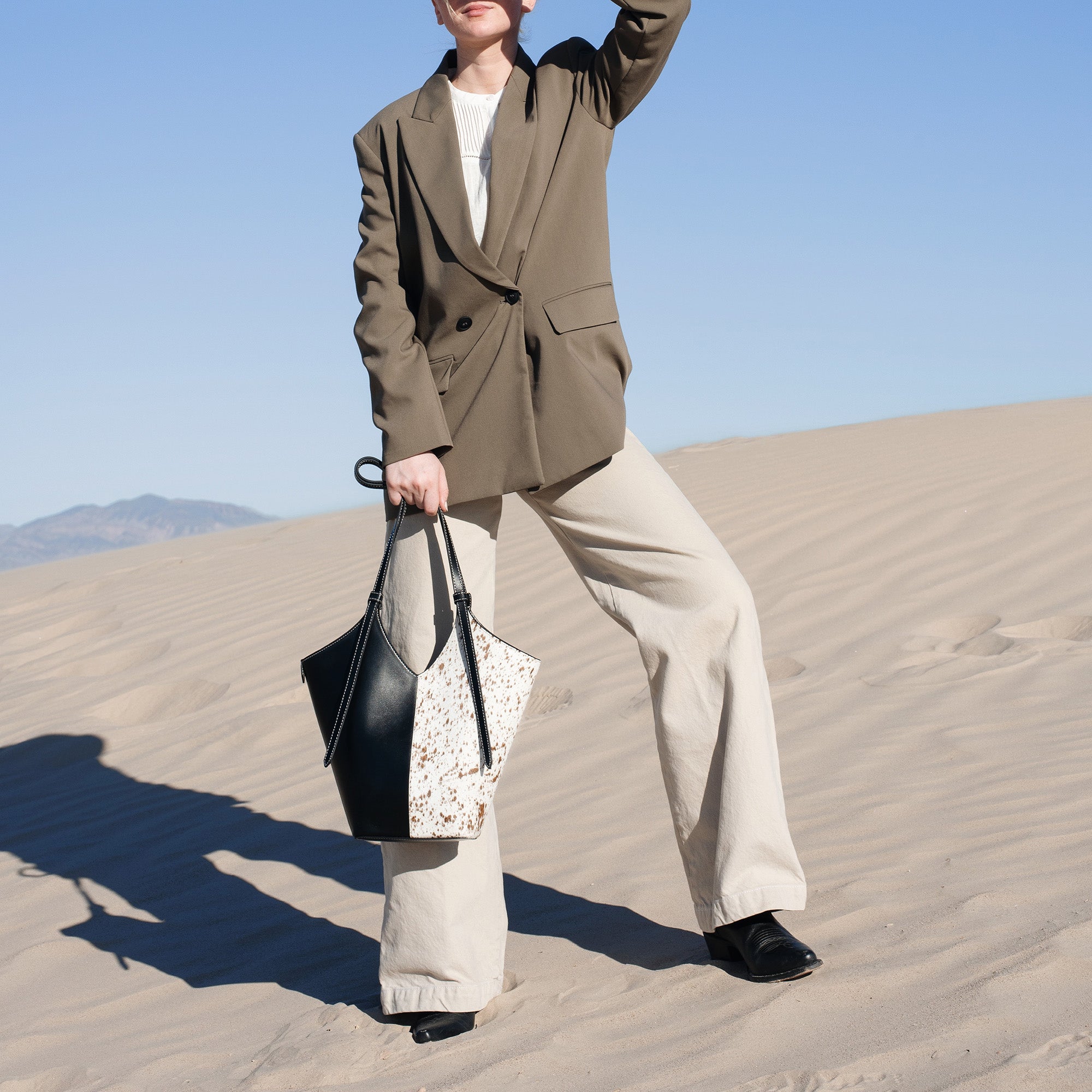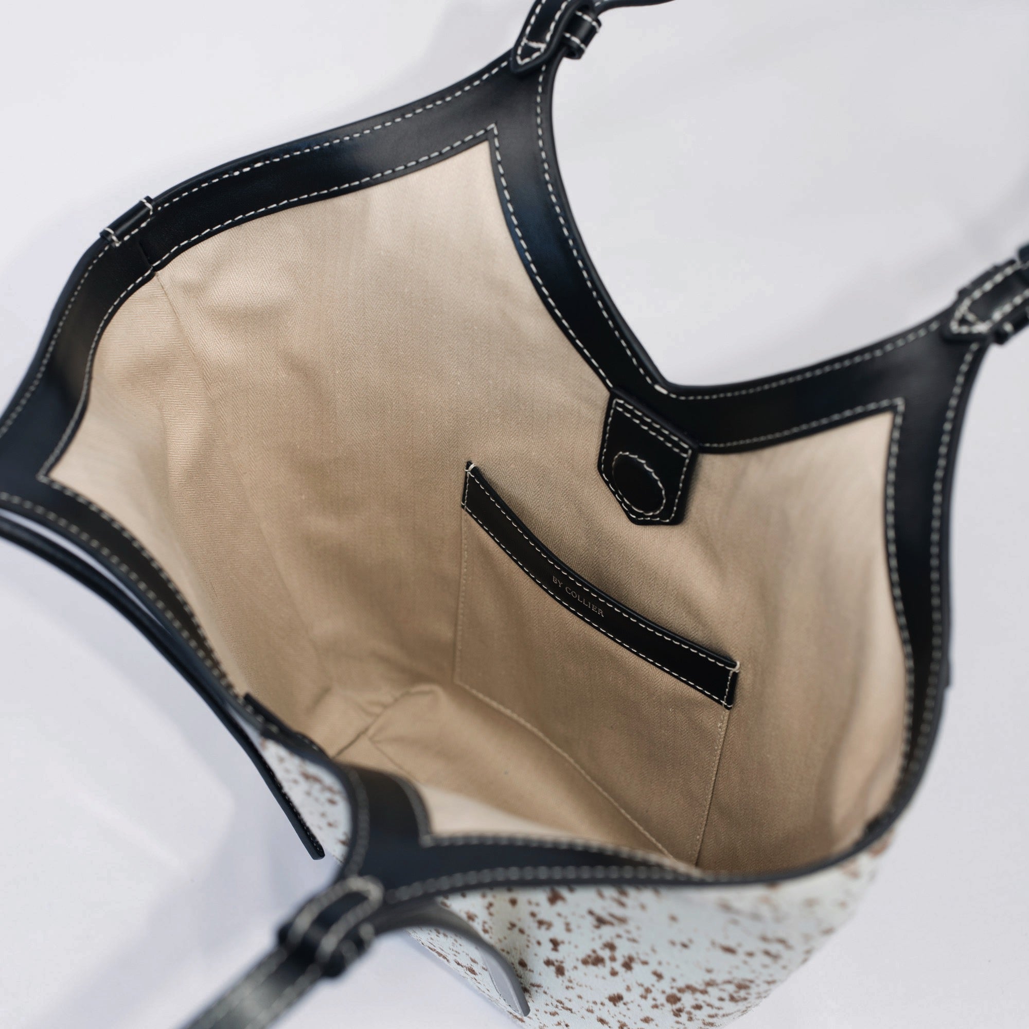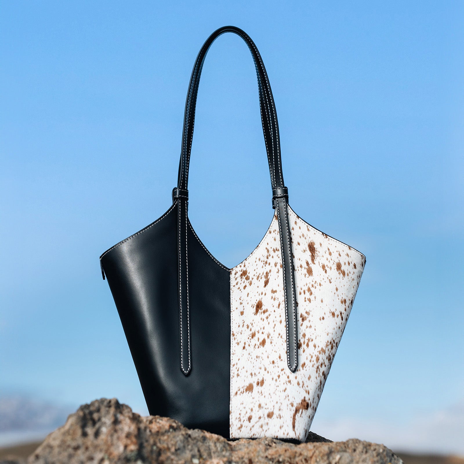 Crafted from genuine hair-on-cattle hide, this material retains the cow's natural hair for a soft, tactile texture. Our calf hair collection isnotmade from young cows. “Calf hair,” “pony hair,” and “hair-on-calf” are industry terms used to describe the look and texture of this type of leather. All of our hides come fromadult cattlethat are a by-product of the meat industry. The spotted print is achieved during the tanning process, giving each hide its own subtle variations in pattern and tone—making every bag unique. The base color is an off-white, and the spots are a warm, light brown.