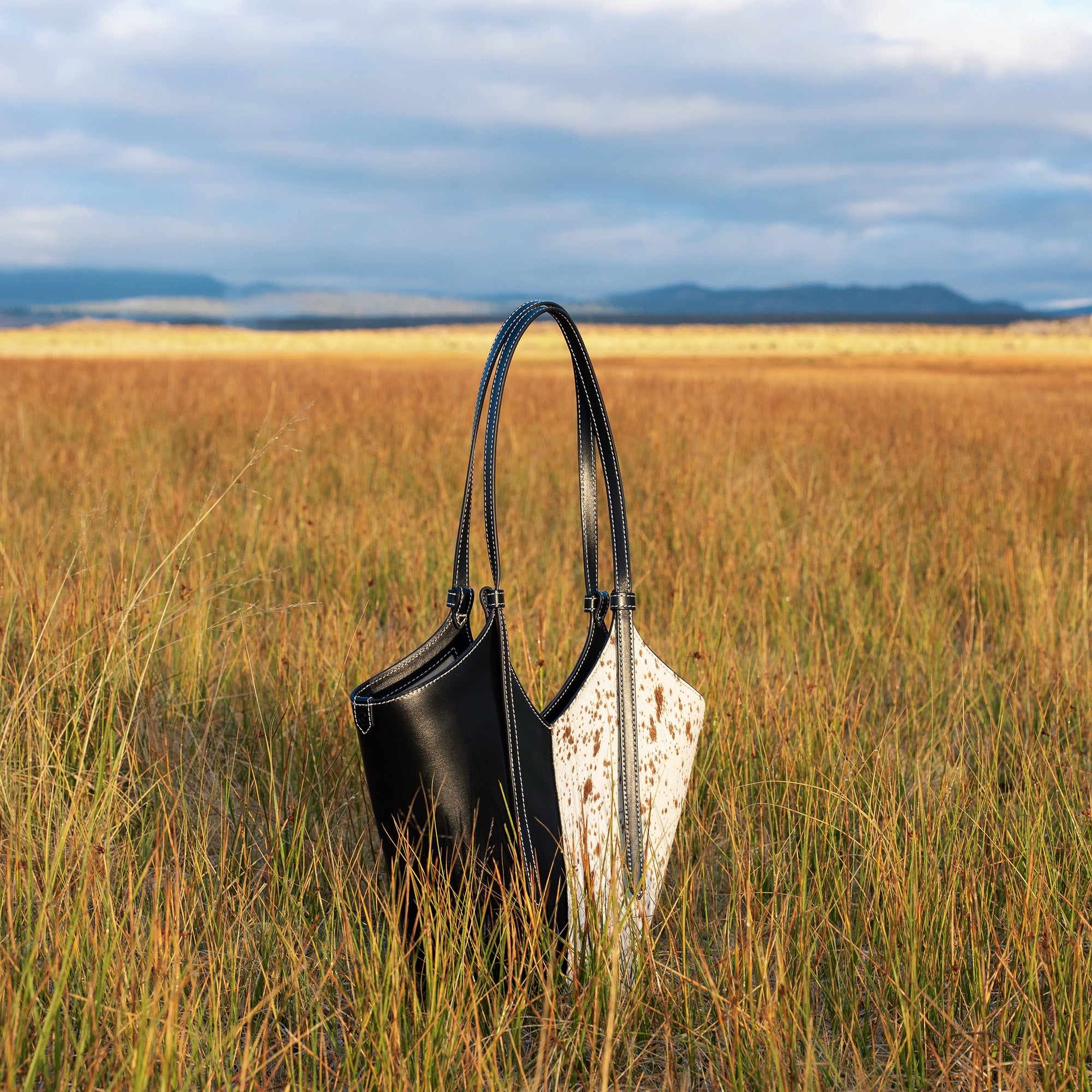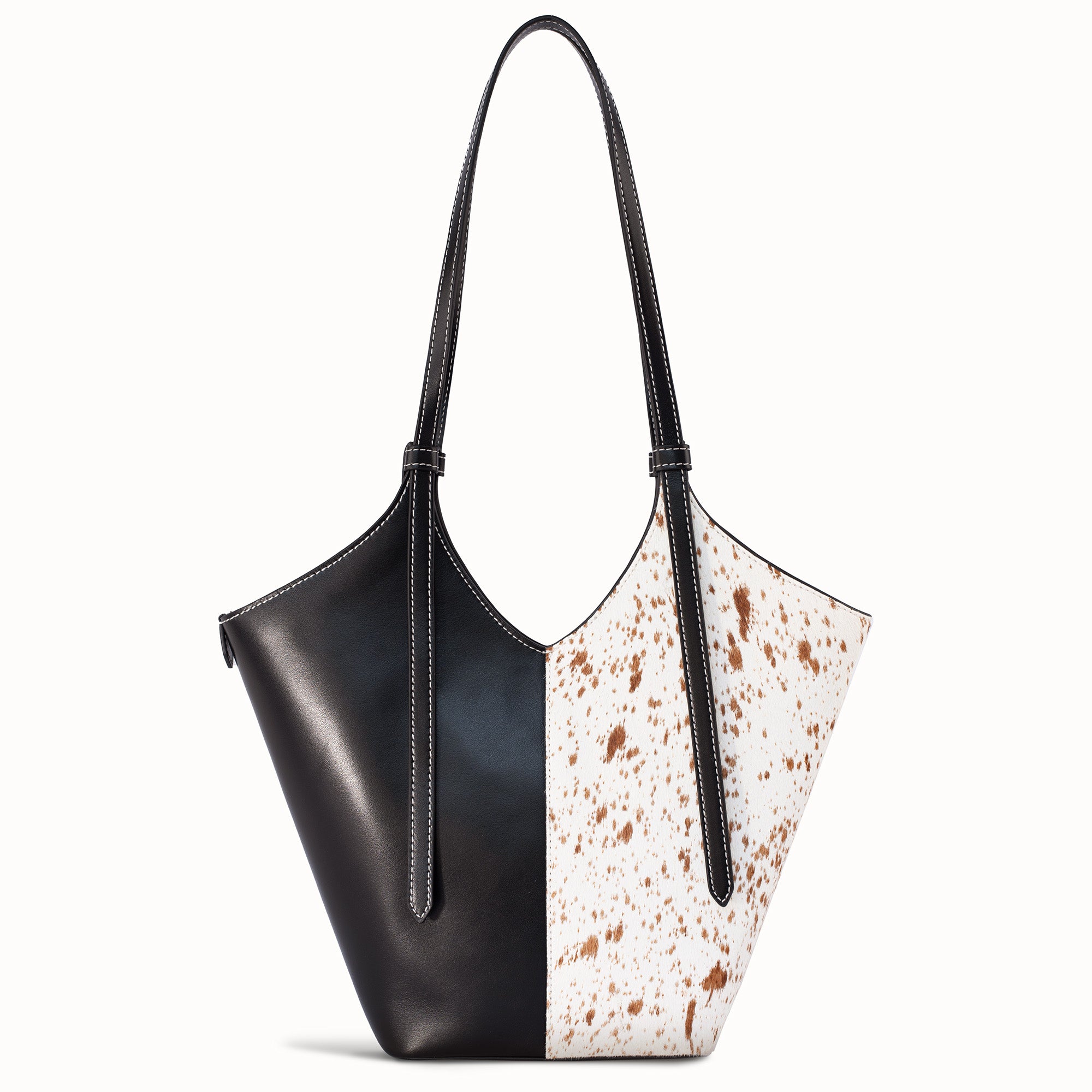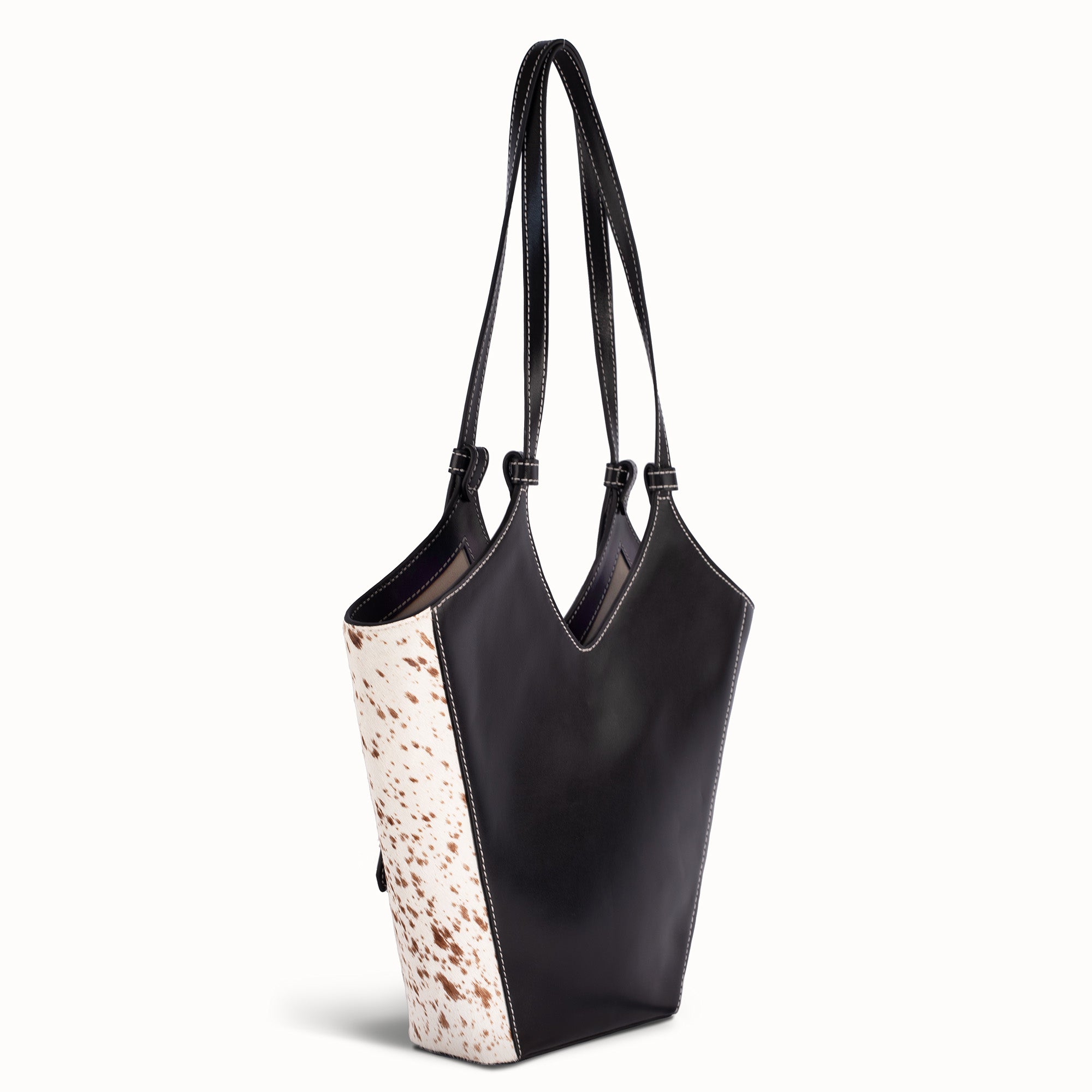Crafted from genuine hair-on-cattle hide, this material retains the cow's natural hair for a soft, tactile texture. Our calf hair collection isnotmade from young cows. “Calf hair,” “pony hair,” and “hair-on-calf” are industry terms used to describe the look and texture of this type of leather. All of our hides come fromadult cattlethat are a by-product of the meat industry. The spotted print is achieved during the tanning process, giving each hide its own subtle variations in pattern and tone—making every bag unique. The base color is an off-white, and the spots are a warm, light brown.