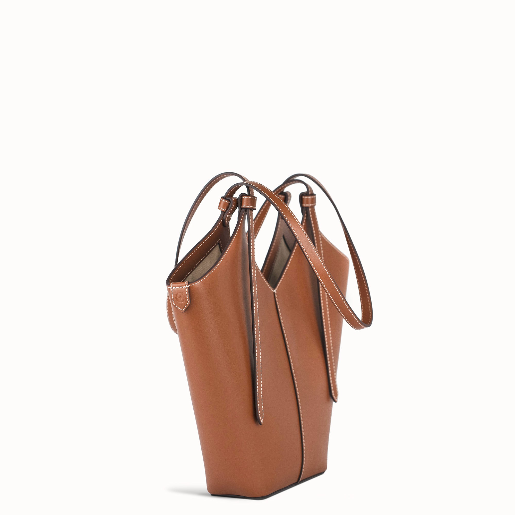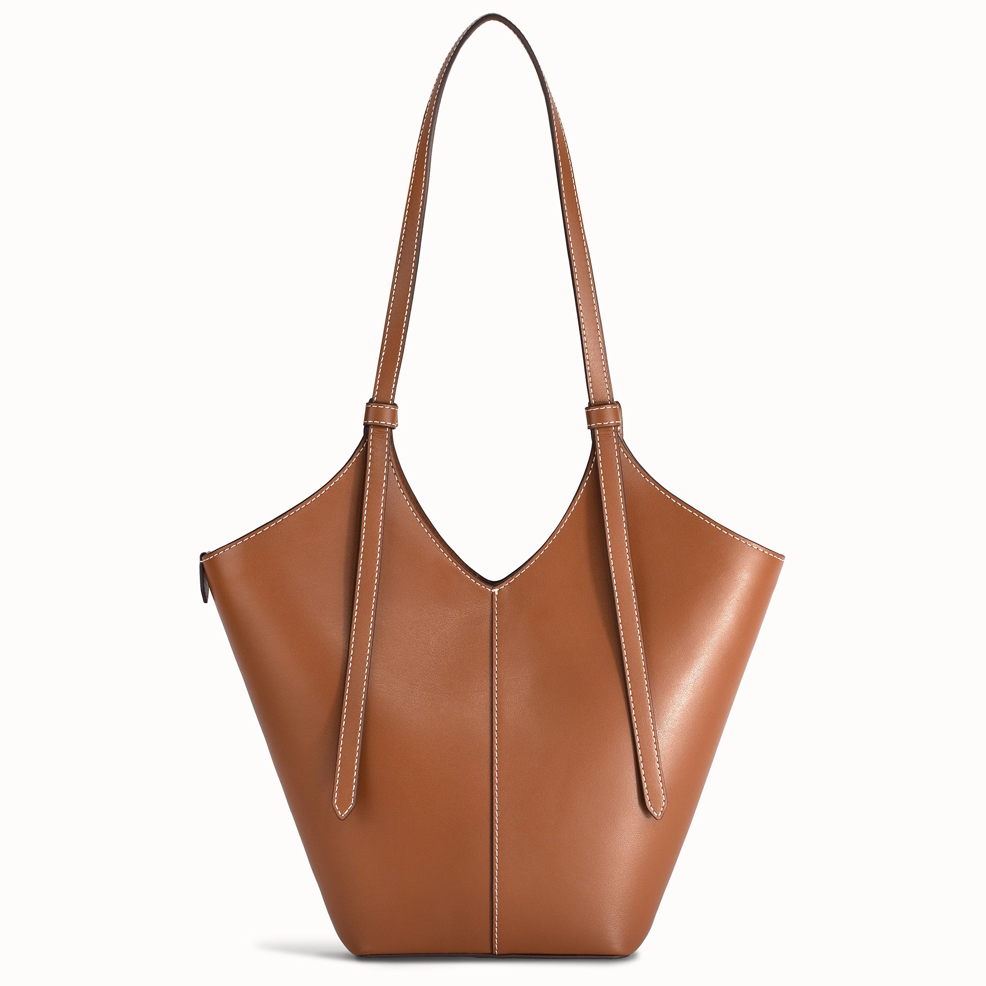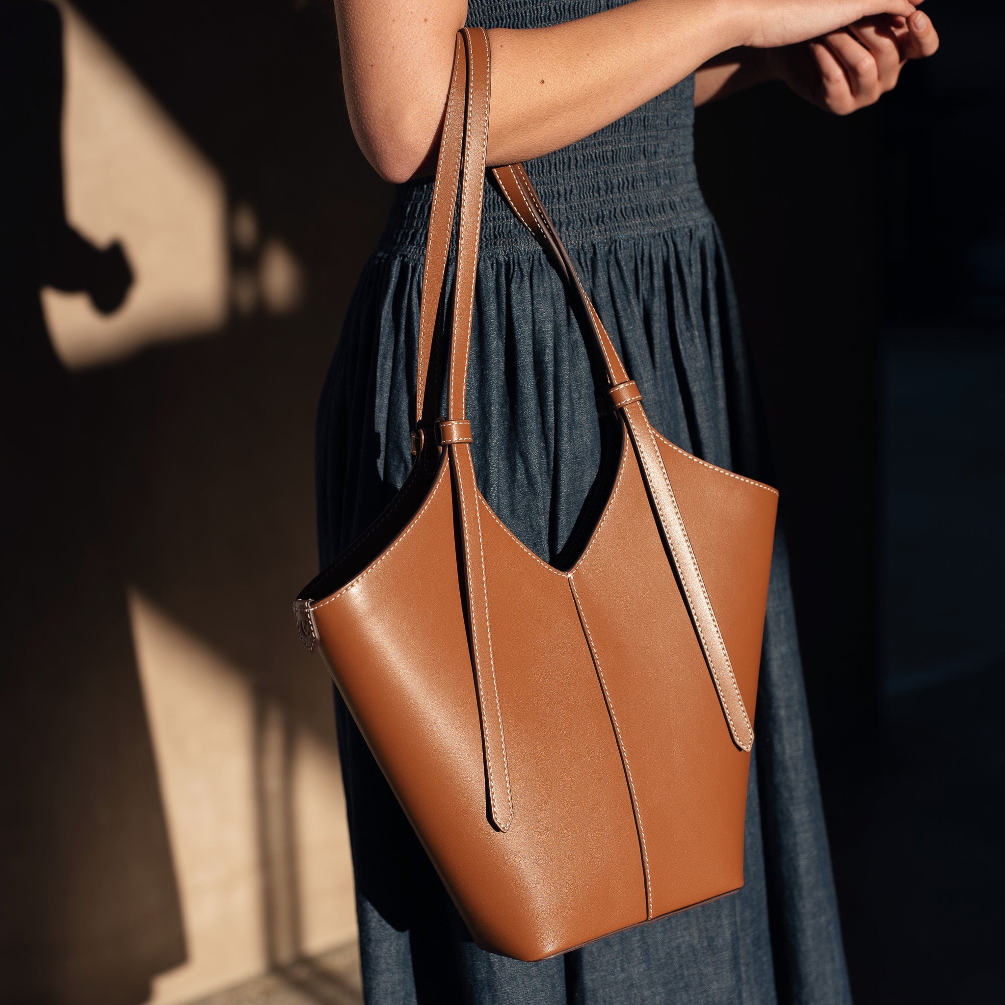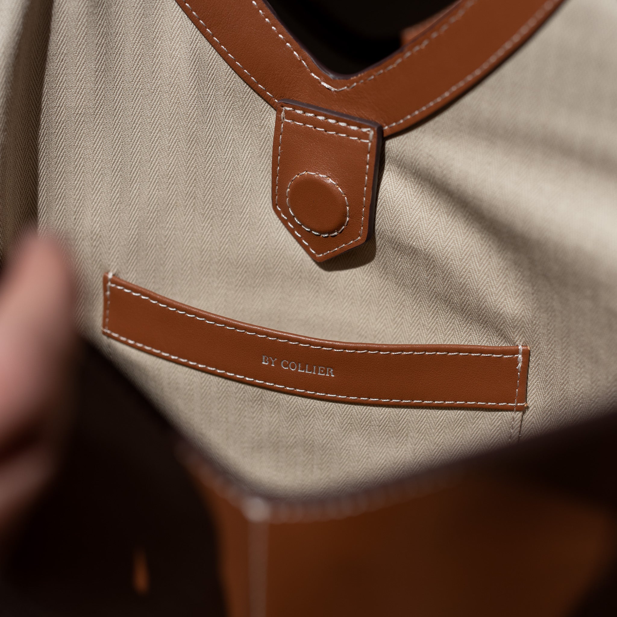 Smooth-grain Italian leather with a medium sheen. Sourced from a tannery certified by the Leather Working Group (LWG)—a non-profit organization that works to promote sustainable and responsible leather manufacturing practices. Color is a warm medium brown with rich caramel undertones. This leather colorway is accented with cream contrast stitching and finished with dark brown edge paint.