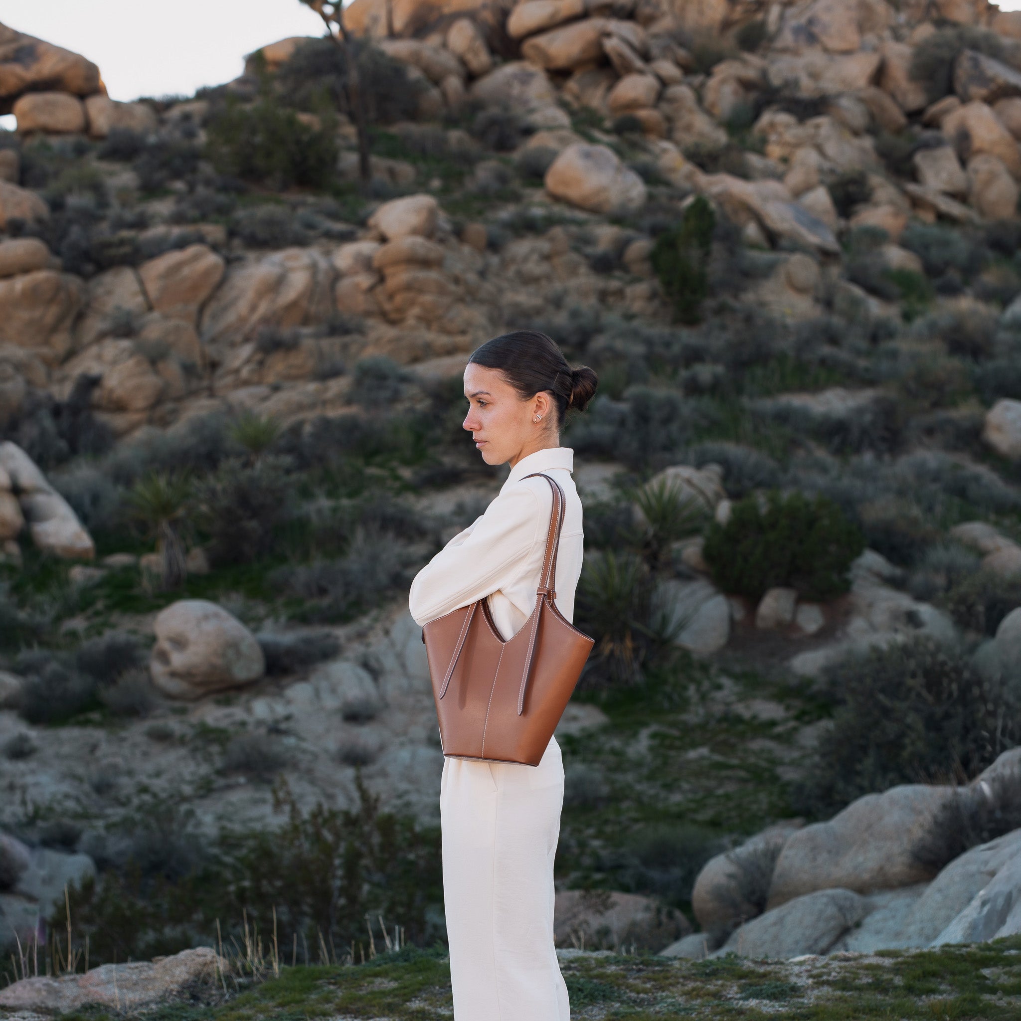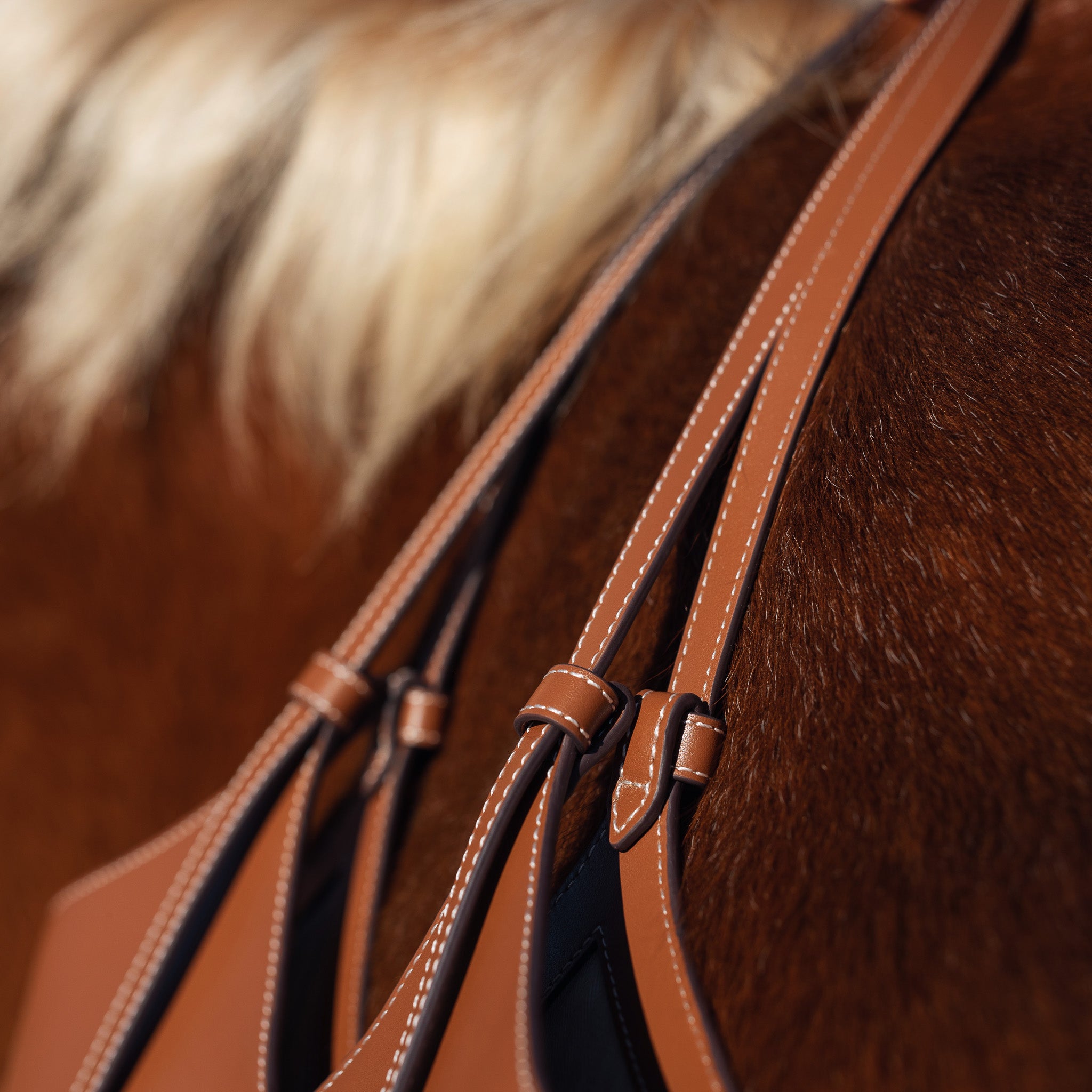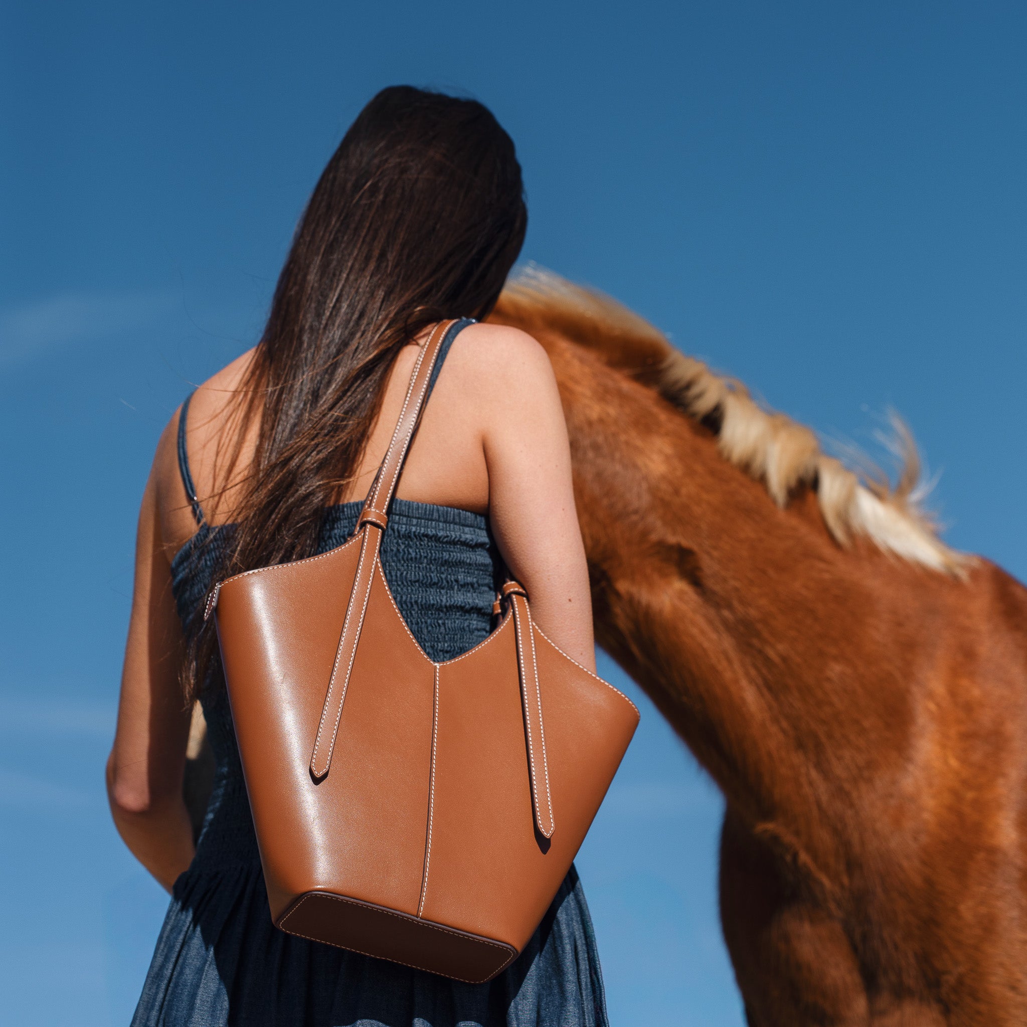 An angular tote handcrafted in Italian leather. This sculptural silhouette is adorned with decorative straps that fall freely against the body of the bag. The design is a nod to Western reins draped over the neck of a horse. The interior features a magnetic closure and a pocket.