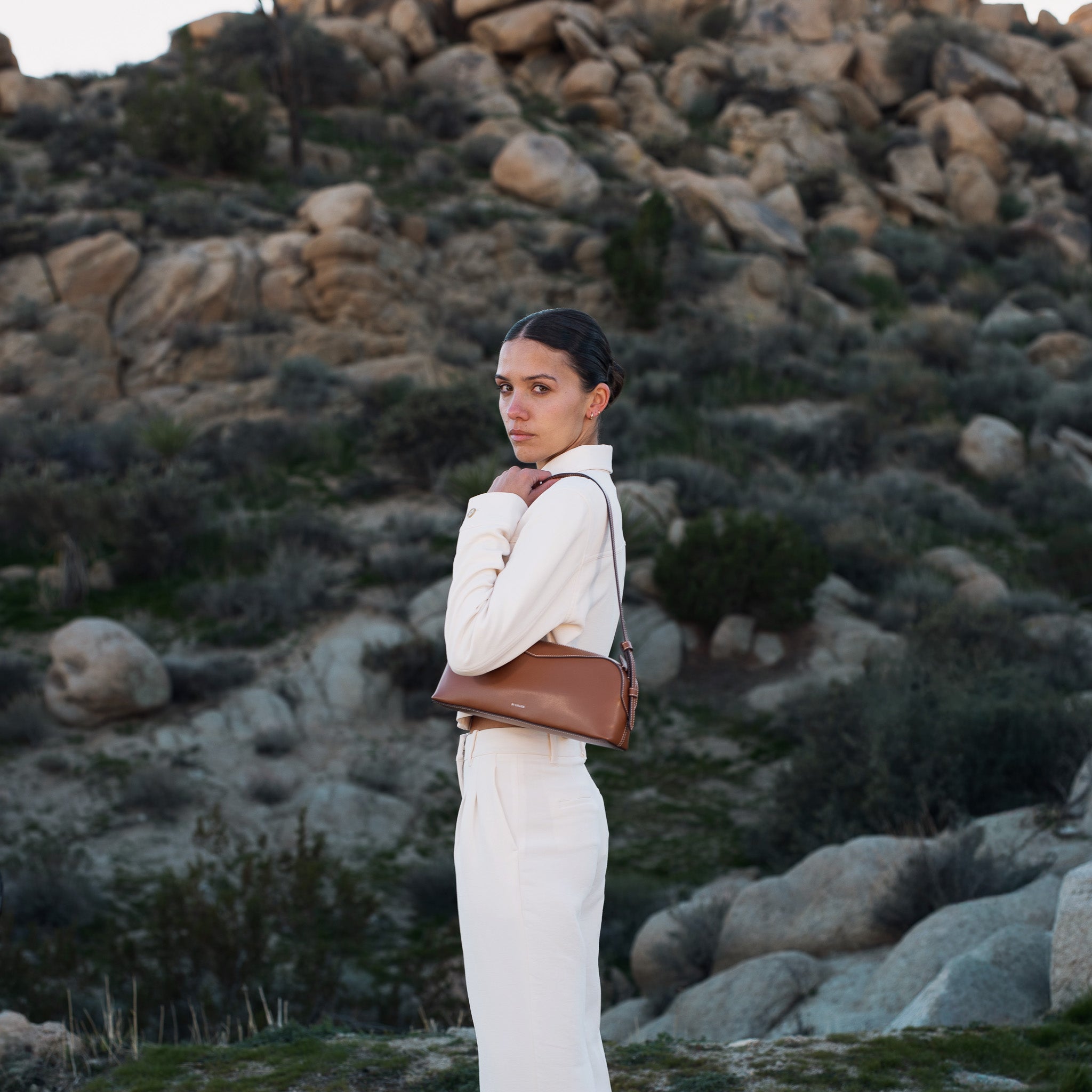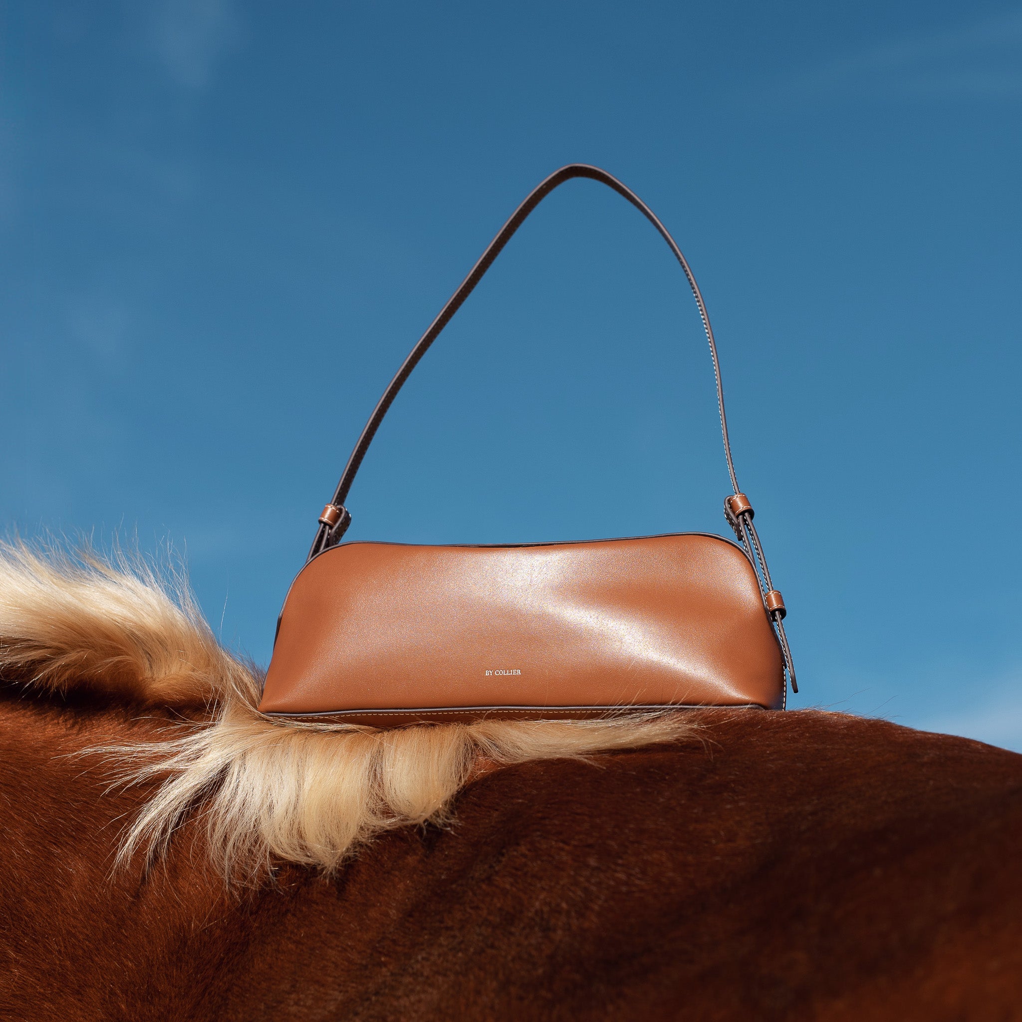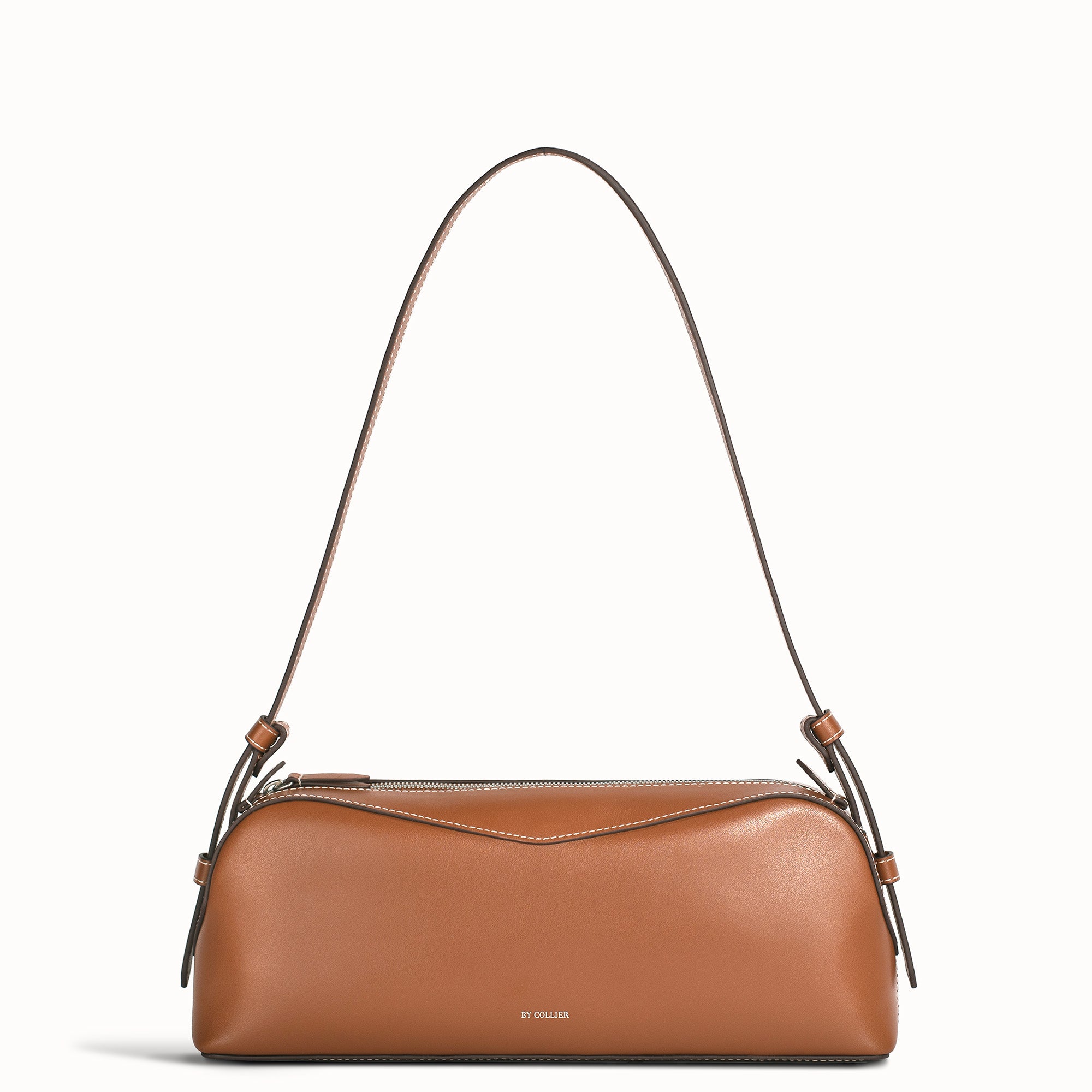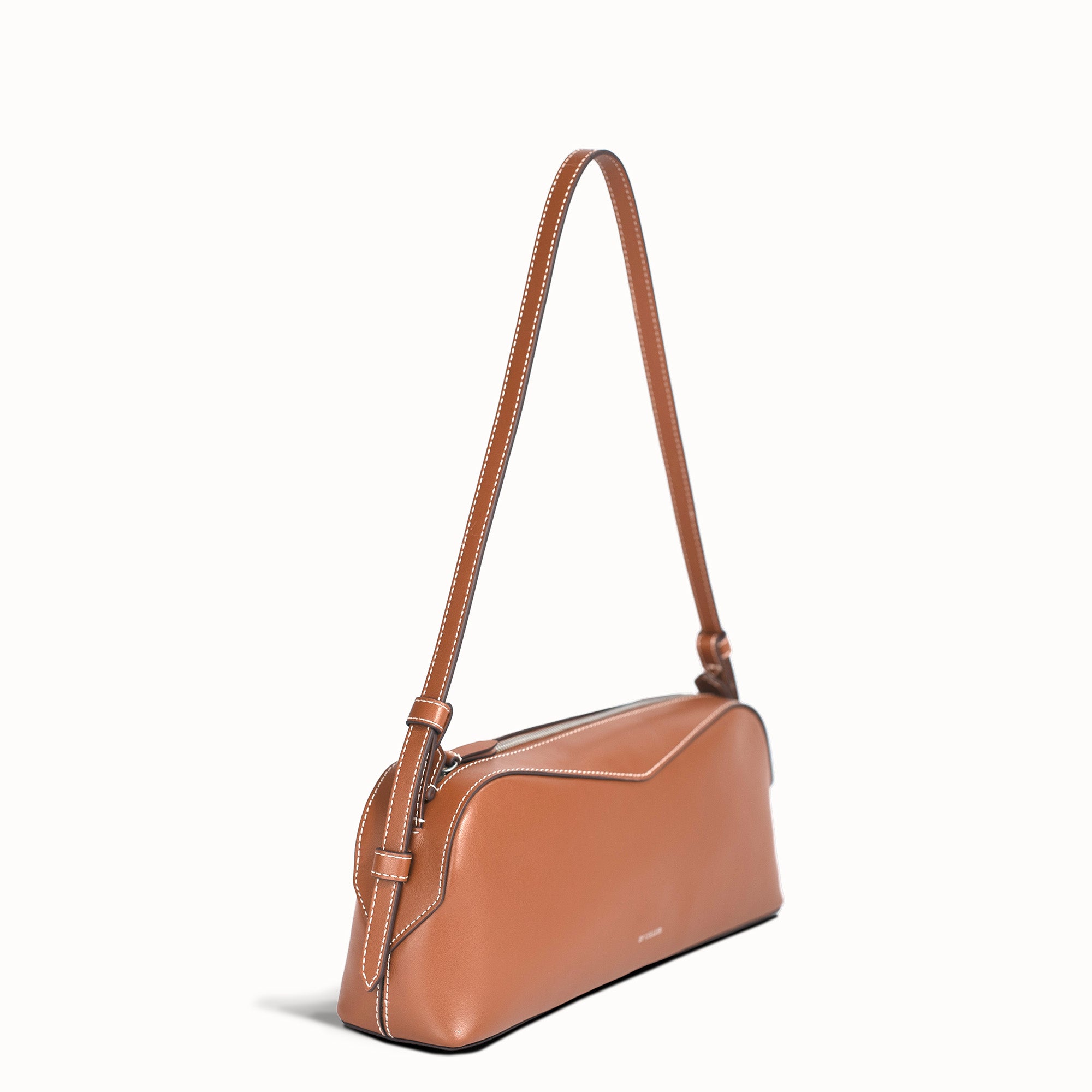A sleek, elongated east–west shoulder bag crafted from Italian leather. This statement silhouette features a decorative top panel, a zippered closure, and an interior pocket. Designed with the perfect capacity for everyday use, it easily fits a water bottle laid flat, along with your daily essentials.
