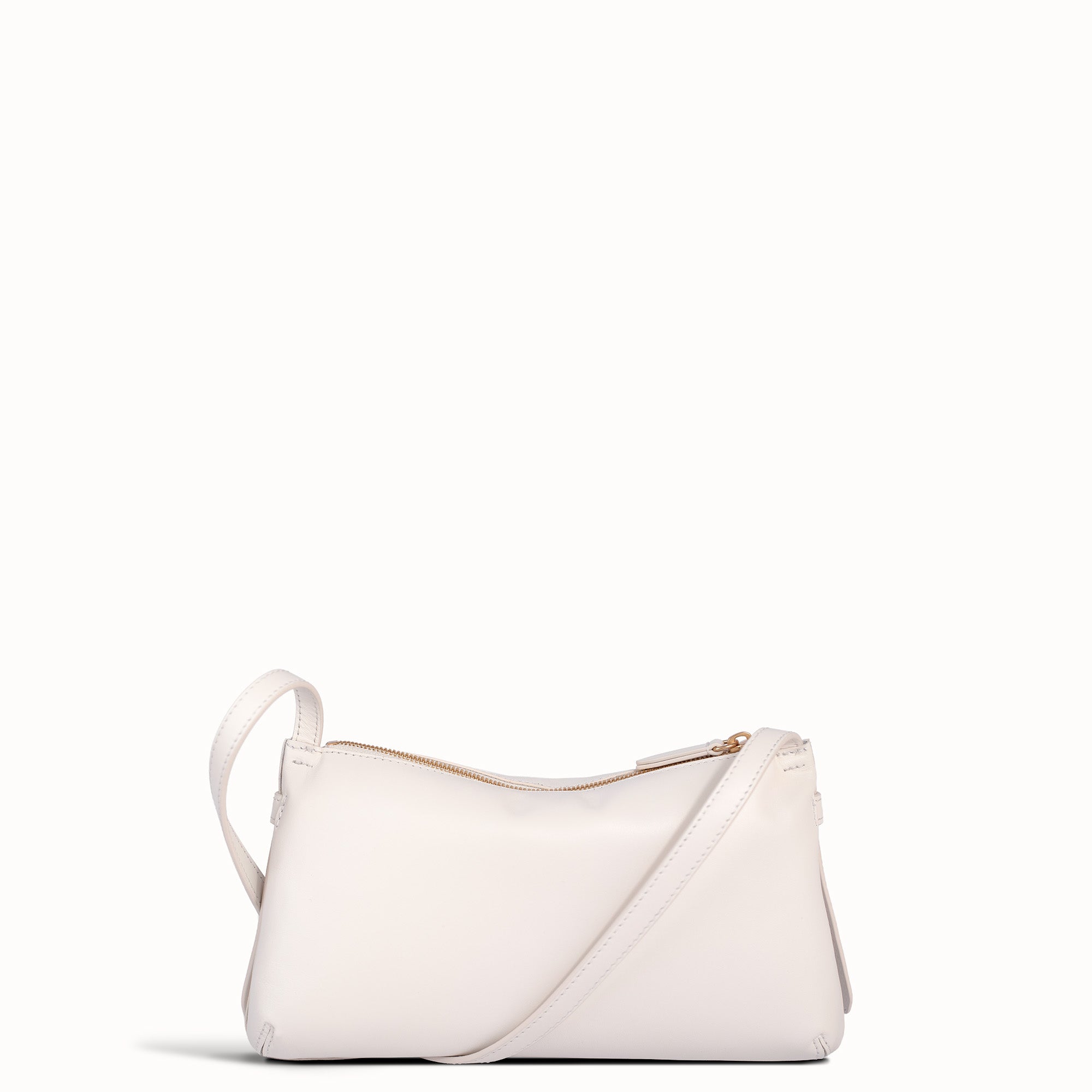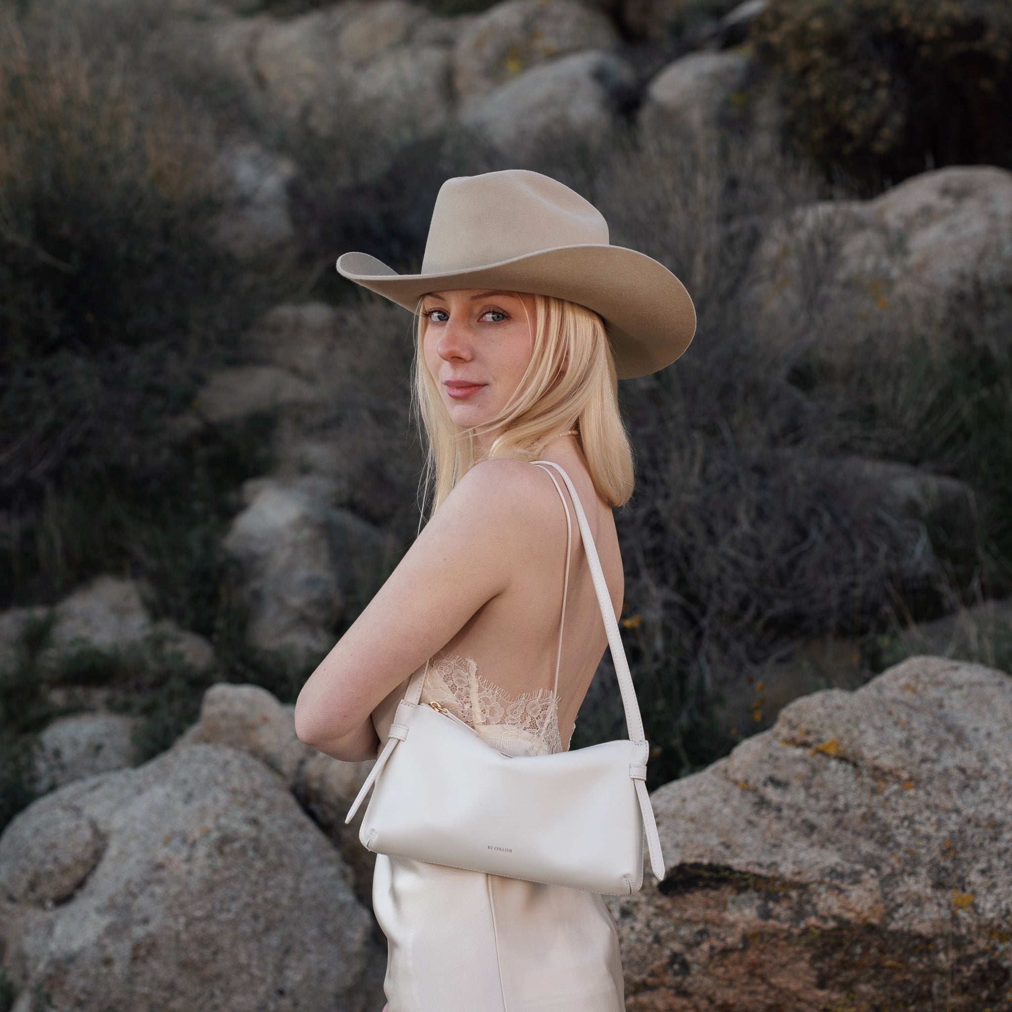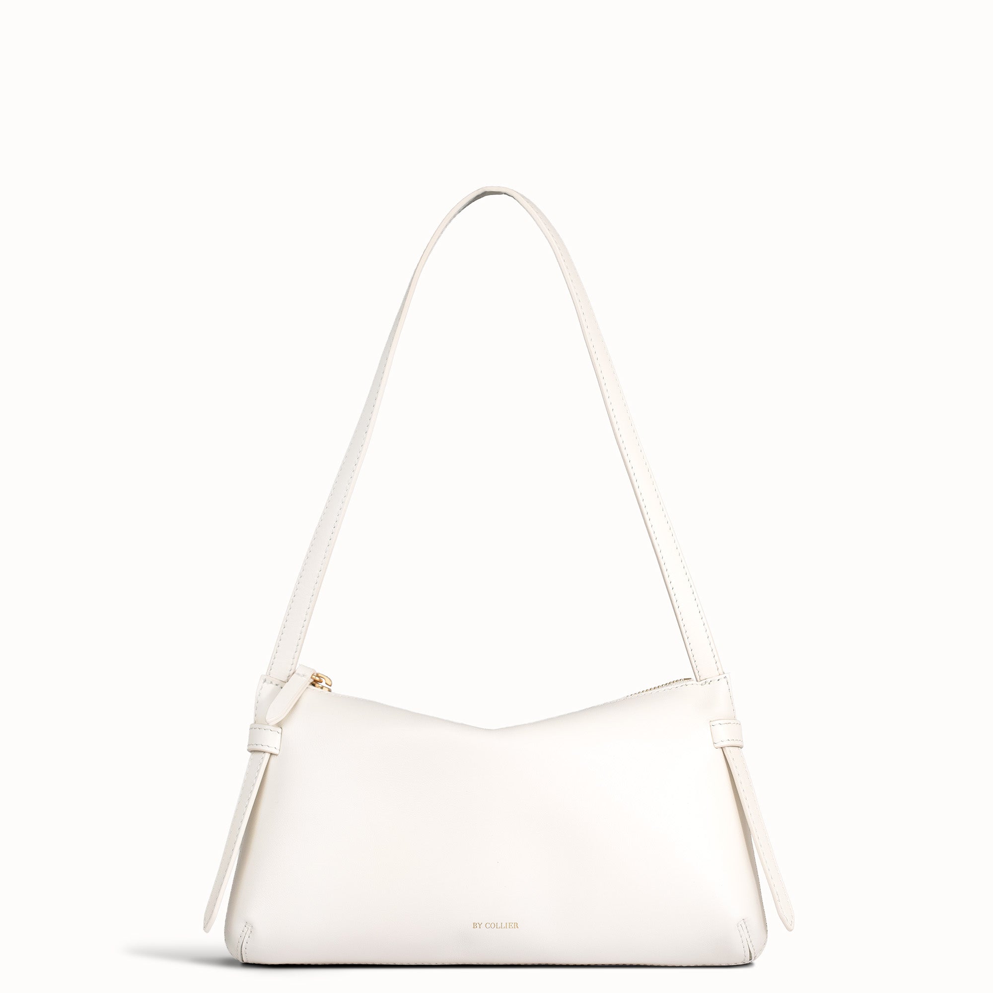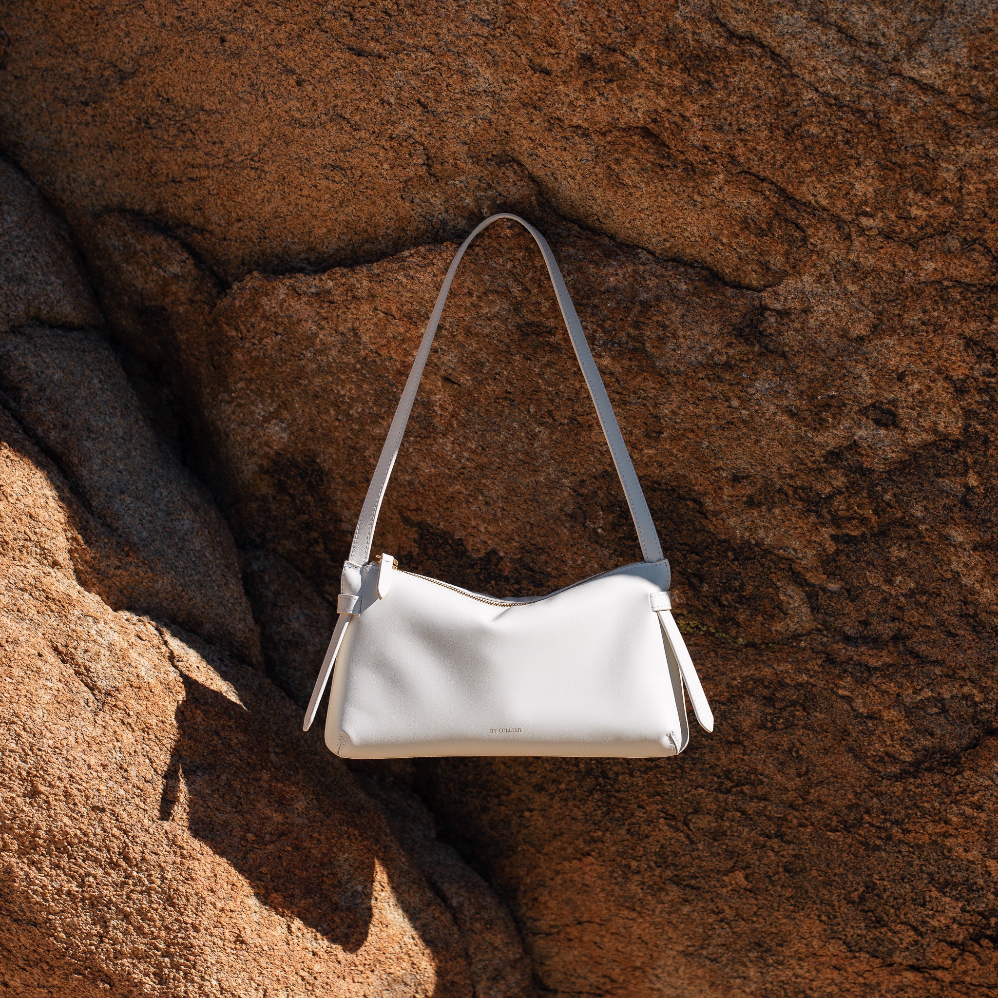 Smooth-grain Italian leather with a medium sheen. Sourced from a tannery certified by the Leather Working Group (LWG)—a non-profit organization that works to promote sustainable and responsible leather manufacturing practices. Color is a warm, bright white. Logo is embossed onto the front exterior and interior of the bag with a gold foil.
