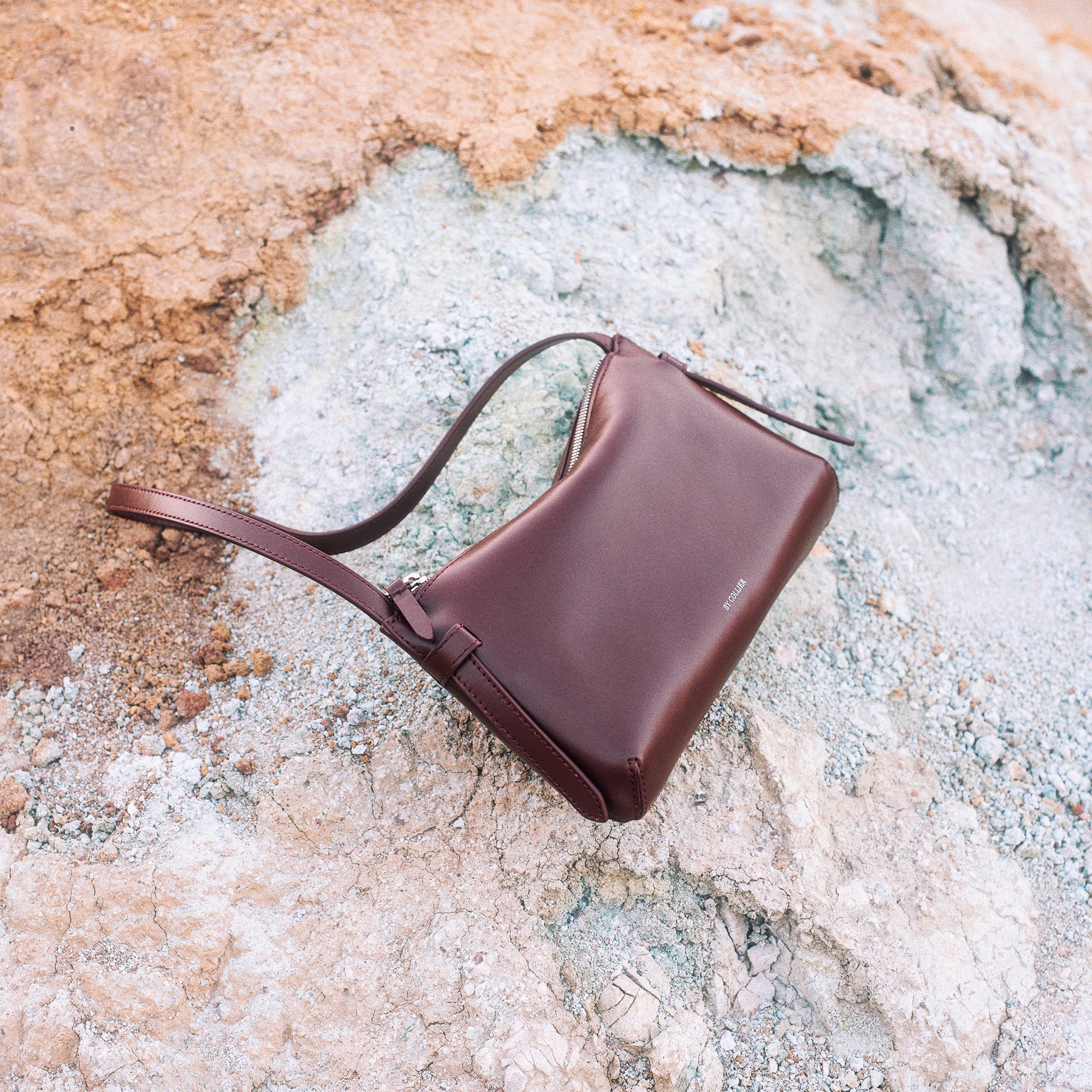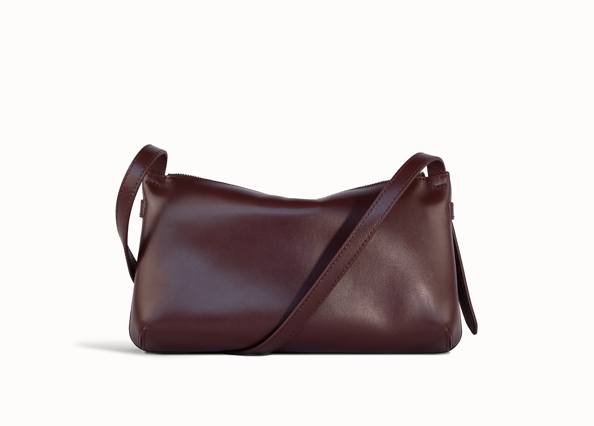 Smooth-grain Italian leather with a medium sheen. Sourced from a tannery certified by the Leather Working Group (LWG)—a non-profit organization that works to promote sustainable and responsible leather manufacturing practices. Color is a rich, dark brown with a subtle plum undertone. Logo is embossed onto the front exterior and interior of the bag with a silver foil.