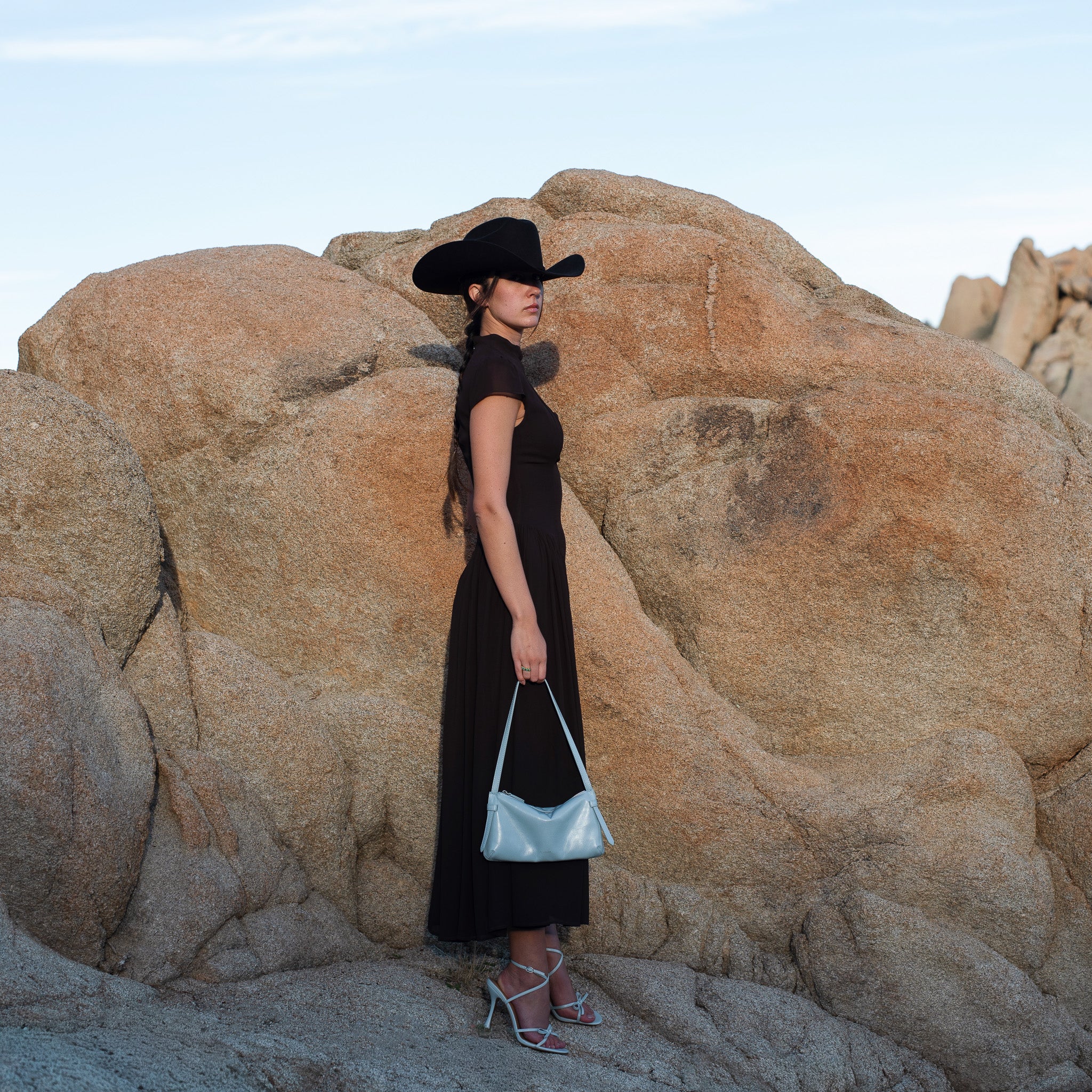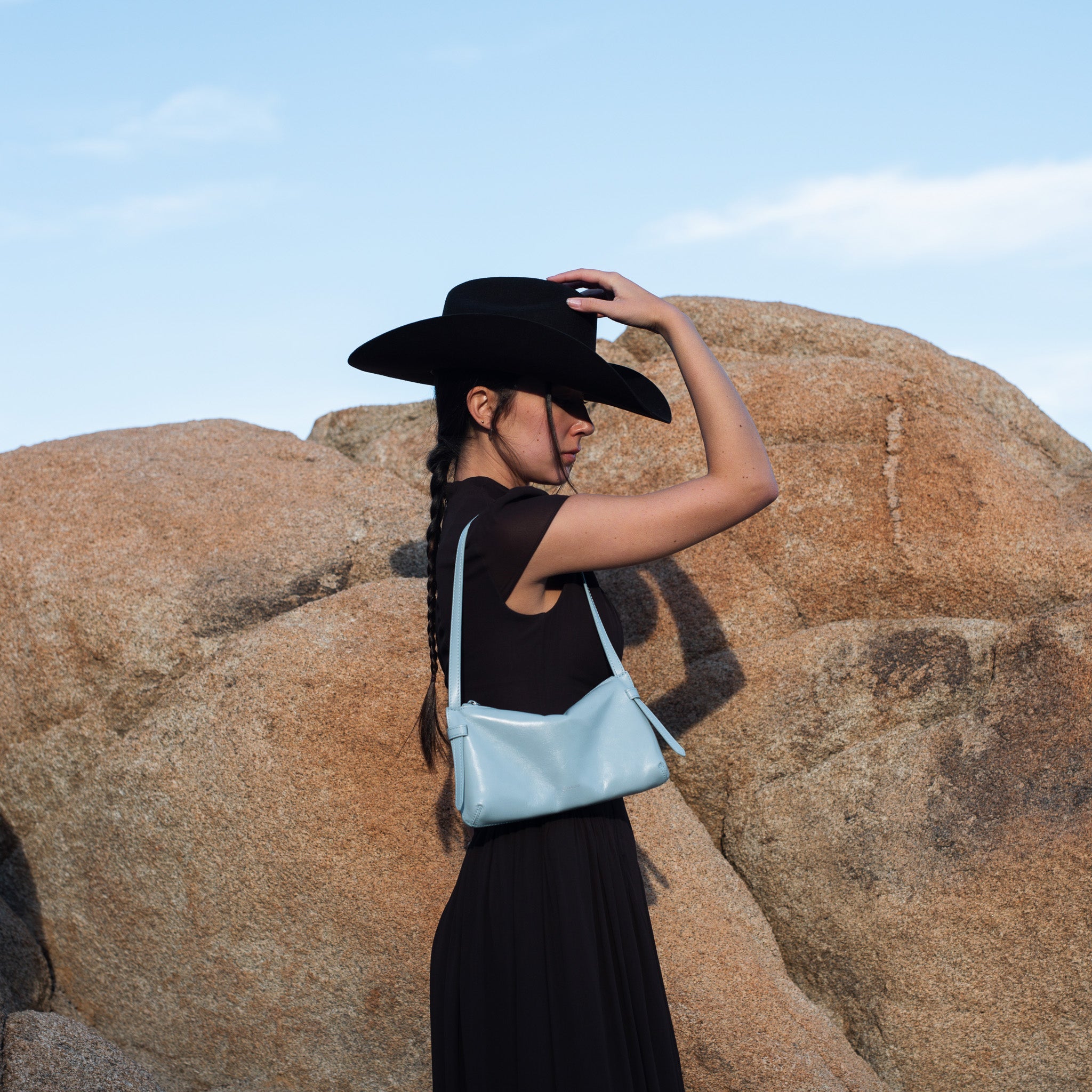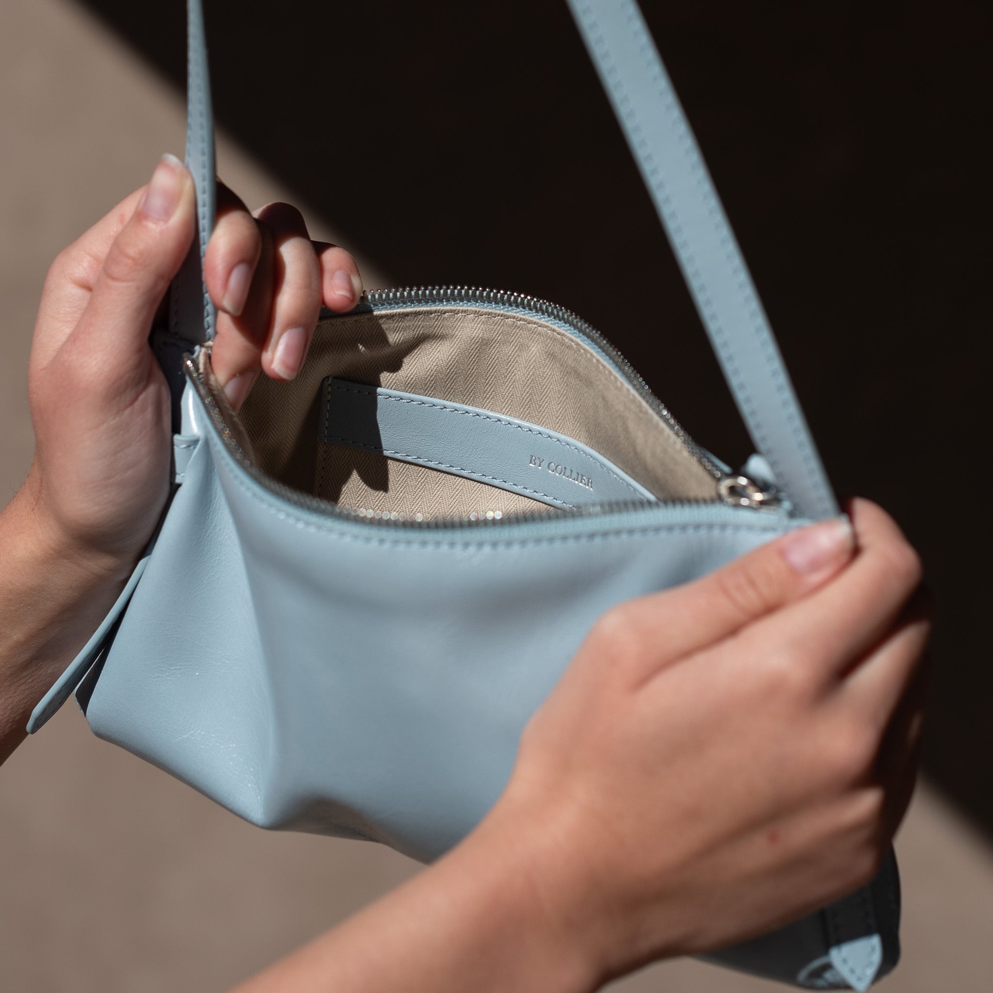 Smooth-grain Italian leather with a high sheen. Sourced from a tannery certified by the Leather Working Group (LWG)—a non-profit organization that works to promote sustainable and responsible leather manufacturing practices. As the name suggests, color is a soft light blue reminiscent of clear sunny days outside. Logo is embossed onto the front exterior and interior of the bag with a silver foil.